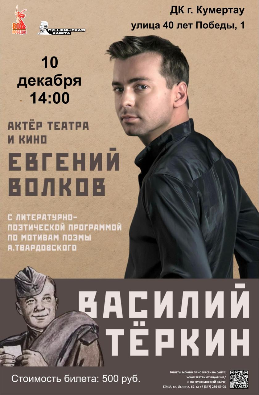 Евгений Волков с литературно-поэтической программой по мотивам поэмы А.Твардовского «Василий Тёркин» — билеты на 10 декабря, 14:00, Дворец культуры Угольщиков (г. Кумертау)