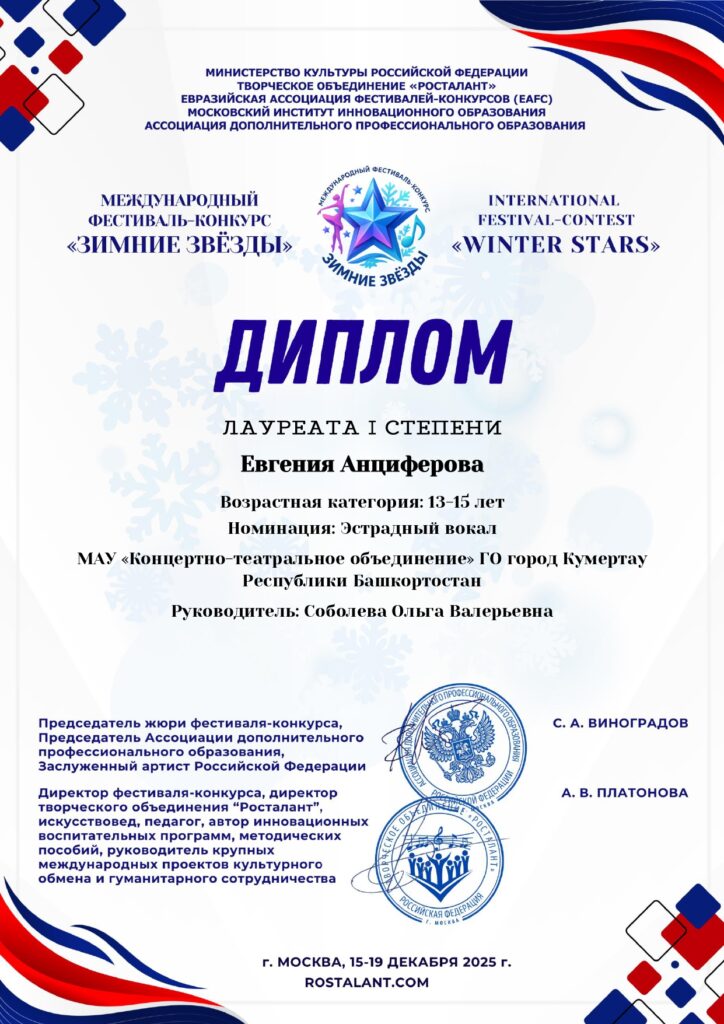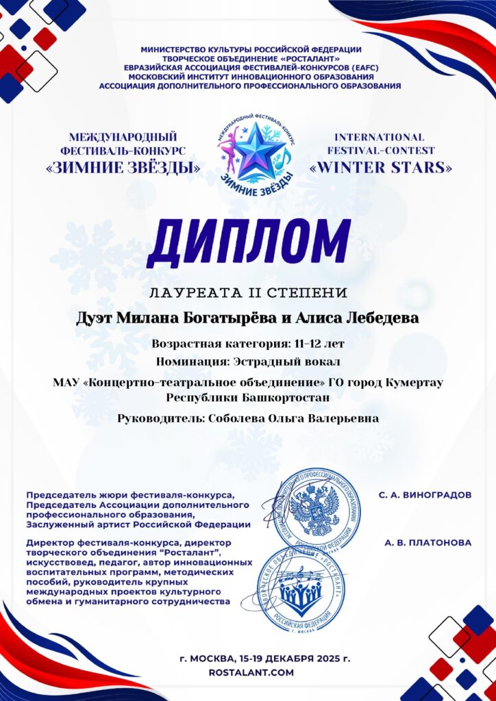 — Диплом участника телевизионного фестиваля, посвящённого году межнационального согласия РБ в городе Мелеуз;