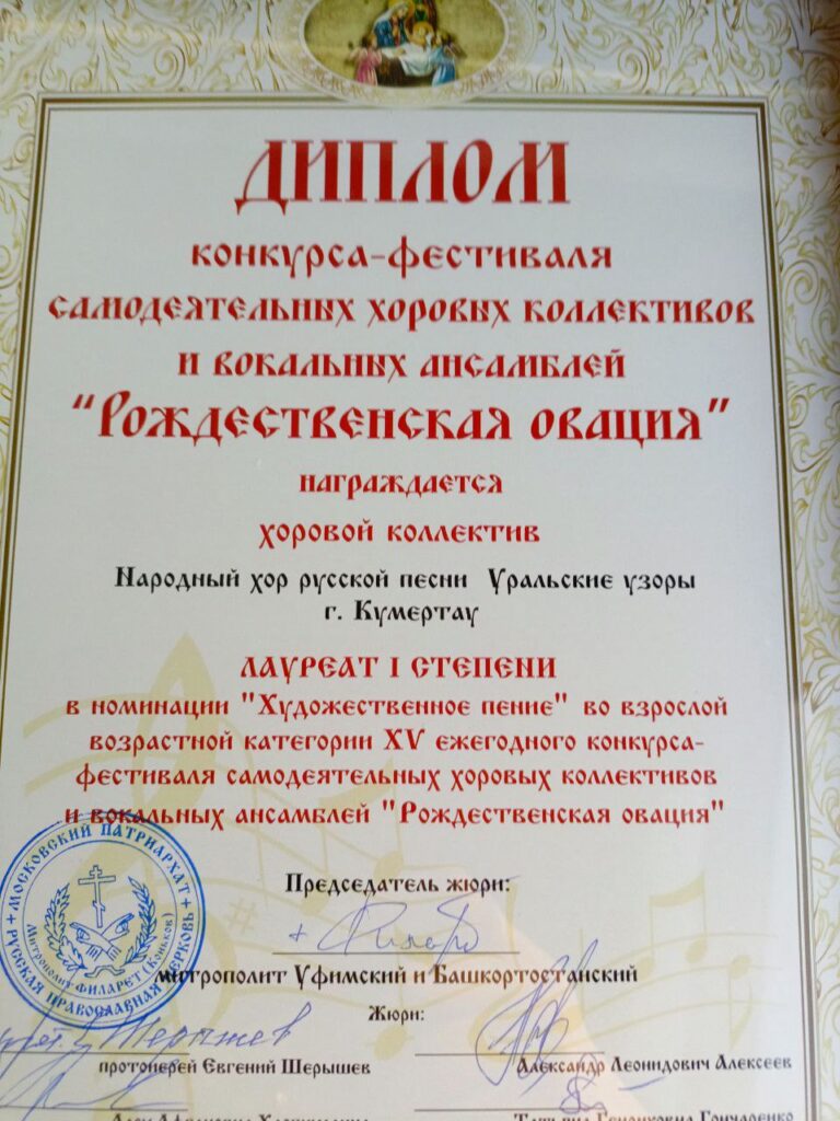 Также разделяем радость успеха и других коллективов, руководит которыми Тамара Дмитриевна: православный хор «Аксиос» (г. Кумертау) – он стал Лауреатом I степени в номинации «Церковное пение»; сводный хор Иоанно-Предтеченского Соборного храма г. Кумертау – он стал Лауреатом I степени в номинации «Художественное пение» и получил также награду за лучший сценический образ; детский хор «Голосок» – Лауреат II степени в номинации «Церковное пение».