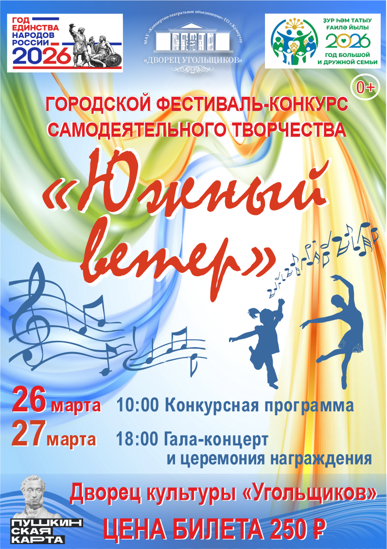 Уважаемые горожане и гости города! Приглашаем принять участие в традиционном городском фестивале-конкурсе самодеятельного творчества «Южный ветер«, который состоится 26 — 27 марта 2026 г.
