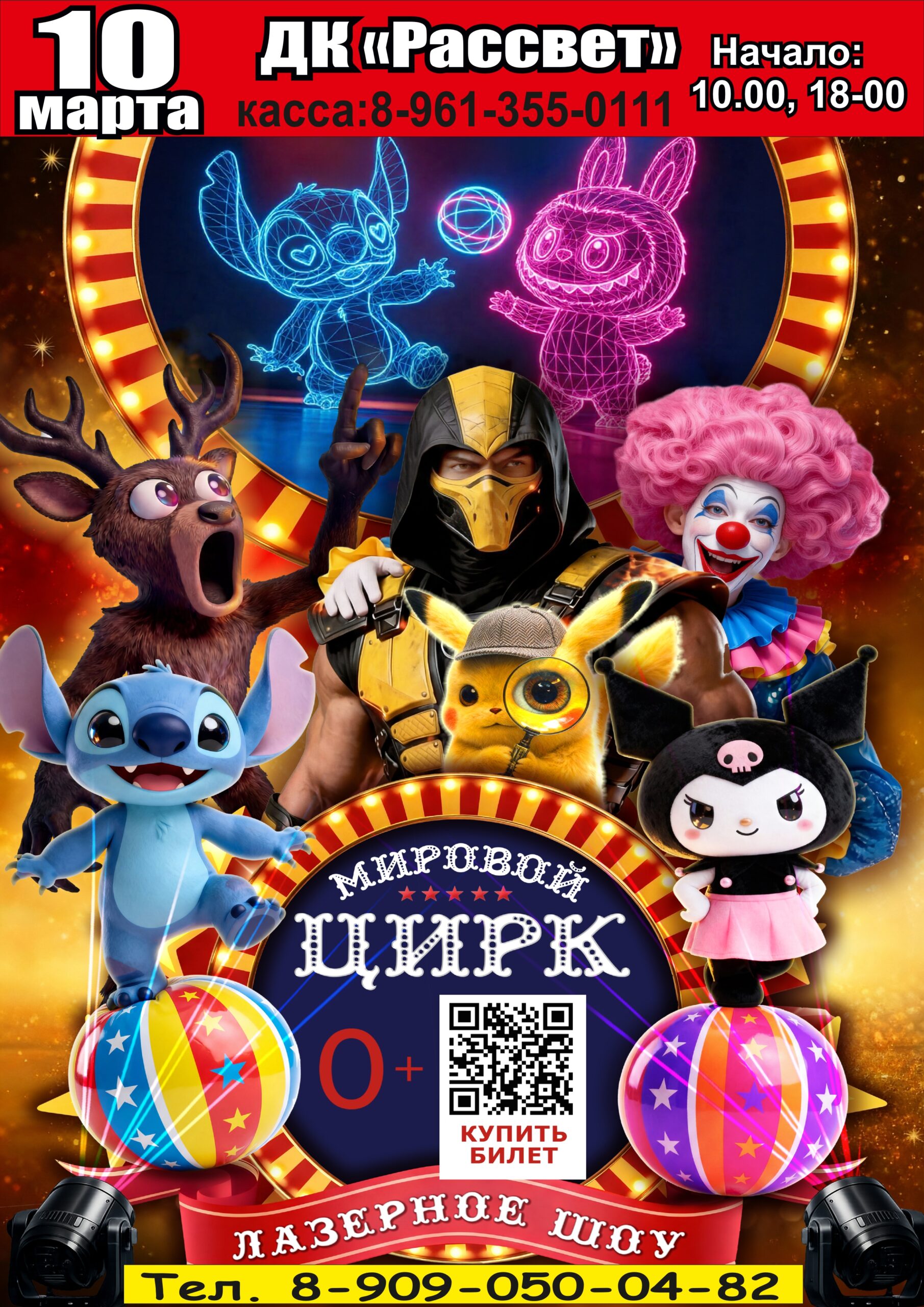 КУМЕРТАУ, ВСТРЕЧАЙ! 10 МАРТА В ДК «РАССВЕТ»! Мировой шоу-цирк с программой «Лазерное шоу» приглашает Вас в увлекательное путешествие в мир волшебства и грации циркового искусства! ️ Начало: 10:00 и 18:00   Цена: от 500 руб. ТОЛЬКО ОДИН ДЕНЬ (вторник) В программе:• Захватывающее лазерное шоу;• Эффектное пиксельное фаер-шоу;• Акробаты, эквилибристы, жонглёры и силачи;• Детектив Пикачу и загадочный Скорпион из Mortal Kombat;• Танцы с пушистиком Лабубу;• Куроми и Стич;• Феерия огромных мыльных пузырей;• Всё представление с Вами самый смешной и весёлый клоун «Костик»  Билеты в кассе ДК «Рассвет» и на сайте:18:00 - https://54show.timepad.ru/event/3835498/#register  Тел. для справок:+7(909)050-04-82Касса: 8 (961)355-01-11  Принимаются коллективные заявки (СКИДКИ
