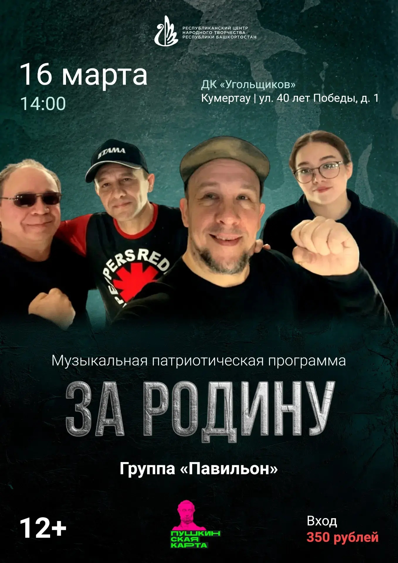 Новая программа "За Родину" Музыкальная группа «Павильон» – коллектив, заслуживший признание жителей Кумертау и других городов Башкирии за искренность, мощную энергетику и глубокий патриотический посыл в своем творчестве. В свойственной музыкантам яркой, эмоциональной и энергичной манере они порадуют слушателей авторскими композициями, повествующими из первых уст о любви к Родине, верности долгу, нерушимой дружбе и стойкости духа. Их песни – это не просто музыка, а живые свидетельства времени: они отражают как личные переживания, так и судьбы тех, кто сегодня стоит на защите мира и безопасности. Особое внимание в их программе