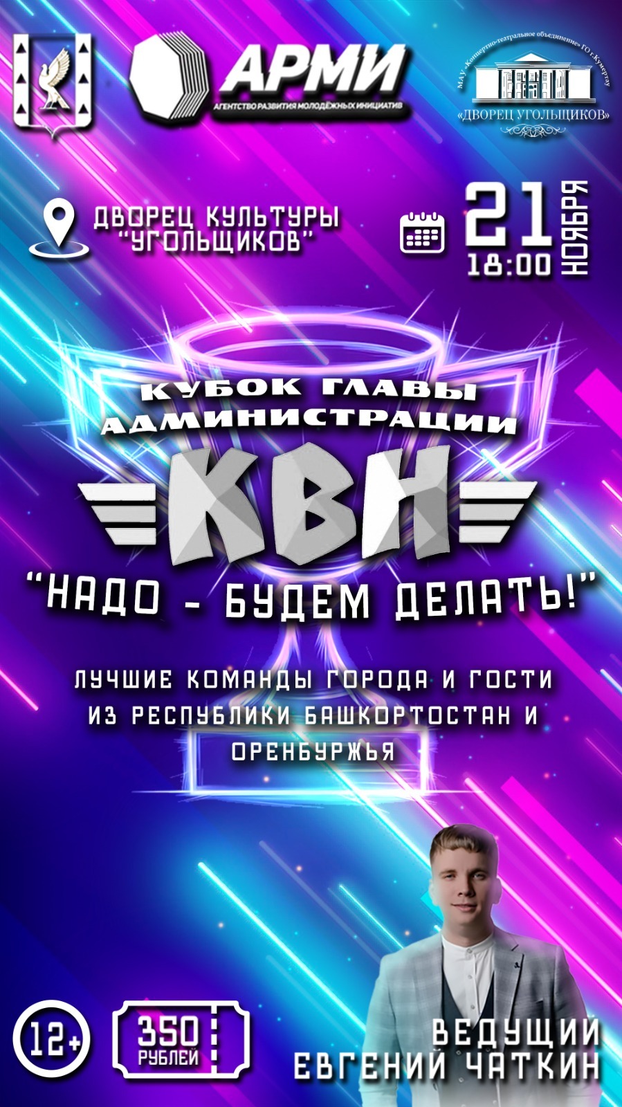 21 ноября 2025 г. в Кумертау состоится игра КВН на Кубок главы администрации города!На сцене Дворца культуры "Угольщиков" встретятся лучшие команды Кумертау, Республики Башкортостан и Оренбуржья! Приходите поддержать свою любимую команду! будет жарко! Начало в 18.00 часов. Цена билета 350 р. Билеты можно приобрести онлайн по ссылке Яндекс Билеты