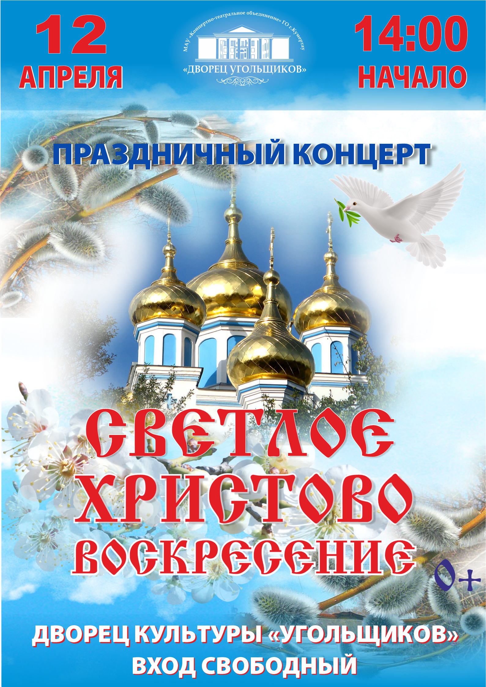 Дорогие жители и гости города Кумертау! Приближается великий православный праздник – Пасха – Светлое Христово Воскресение. Именно так называется праздничный концерт, который коллектив Концертно-театрального объединения каждый год готовит для православных верующих и всех, кто неравнодушен к искусству и уважает традиции другой религии. Приглашаем на концерт "Светлое Христово Воскресение" 12 апреля в 14:00 часов. В праздничной программе для вас выступят творческие коллективы и солисты: Народный хор русской песни "Уральские узоры" и детский хор "Голосок" воскресной школы и сводный хор Иоанно-Предтеченского Соборного храма г. Кумертау, Народный ансамбль русской песни "Уральские зори", Народный