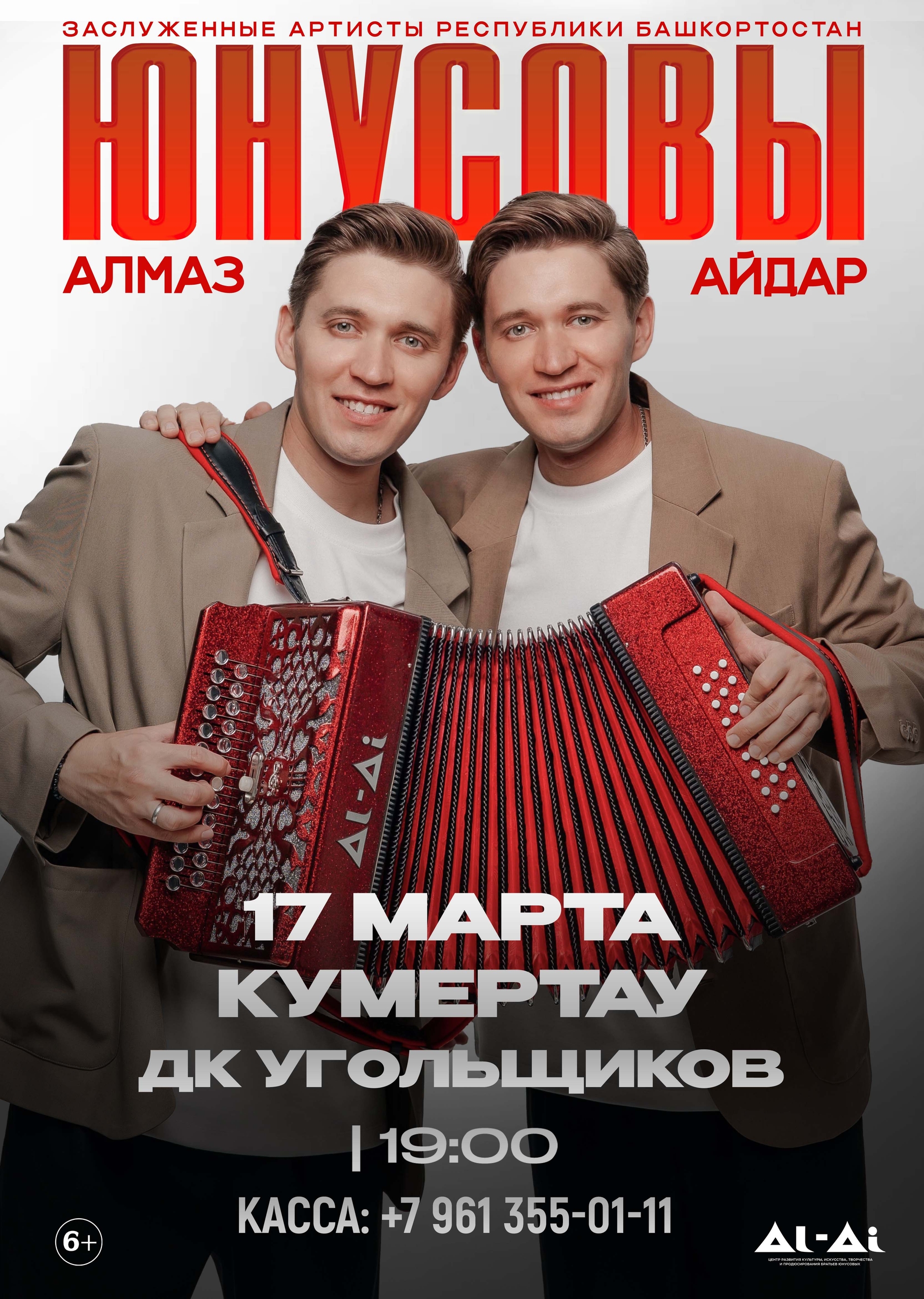 Айдар и Алмаз Юнусовы — Заслуженные артисты Республики Башкортостан, близнецы, авторы-исполнители популярных татарских песен, мастера игры на баянах, тальянках. Братья выросли в атмосфере любви к музыке и культуре родного края. Получив профессиональное образование, они посвятили себя творчеству — сочинению и исполнению песен, а также развитию искусства игры на баяне, создав собственный стиль, который сочетает в себе мастерство импровизации, виртуозность владения инструментом и глубокую связь с народными корнями. Каждый концерт братьев Юнусовых становится настоящим праздником, объединяя народы и поколения, демонстрируя всему миру богатство русской, татарской и башкирской